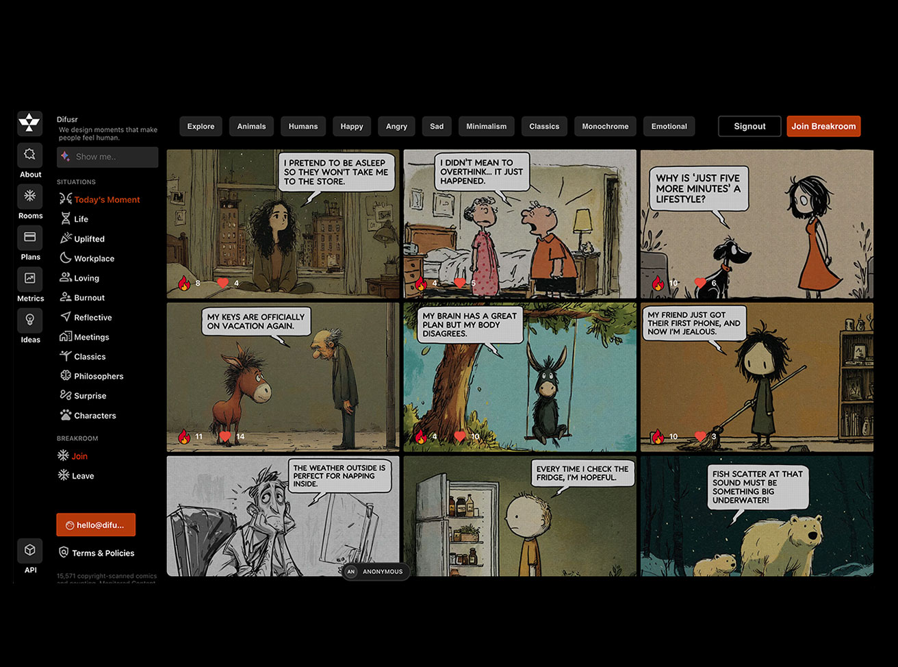 Difusr is a place you go when you need a moment. Just like physical offices had that space you'd step into for 10 seconds to decompress, grab coffee, and remember you're not alone - we're the digital version for hybrid and remote work. We've built 16,000+ workplace comics that power three experiences: a personal library for individual expression, a shared team breakroom where moments flow throughout the day, and DifusrTV - our broadcast channel that's always on, like the TV in the old breakroom. Not a tool. A place.